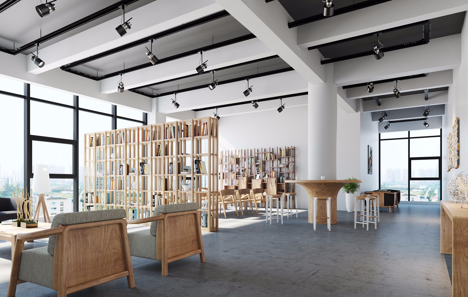 loft風(fēng)格的辦公室通常采用簡潔明快的顏色搭配,如白色、灰色、藍色等。可以選擇使用這些顏色的墻面、地面以及家具,營造出時尚簡約的氛圍。